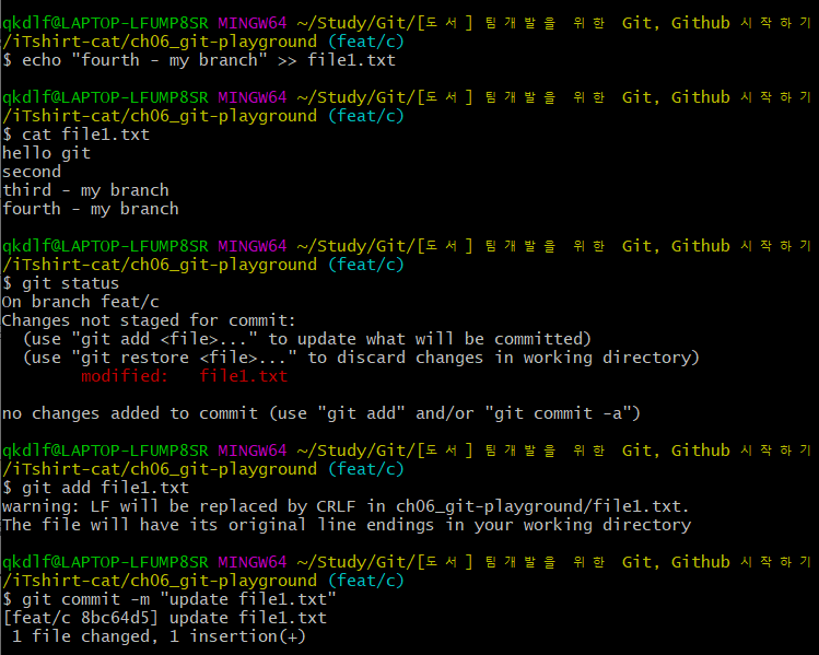 (feat/c) ch06_git-playground $ echo "fourth - my branch" >> file1.txt # 파일에 내용 추가
