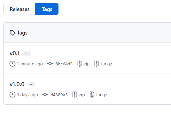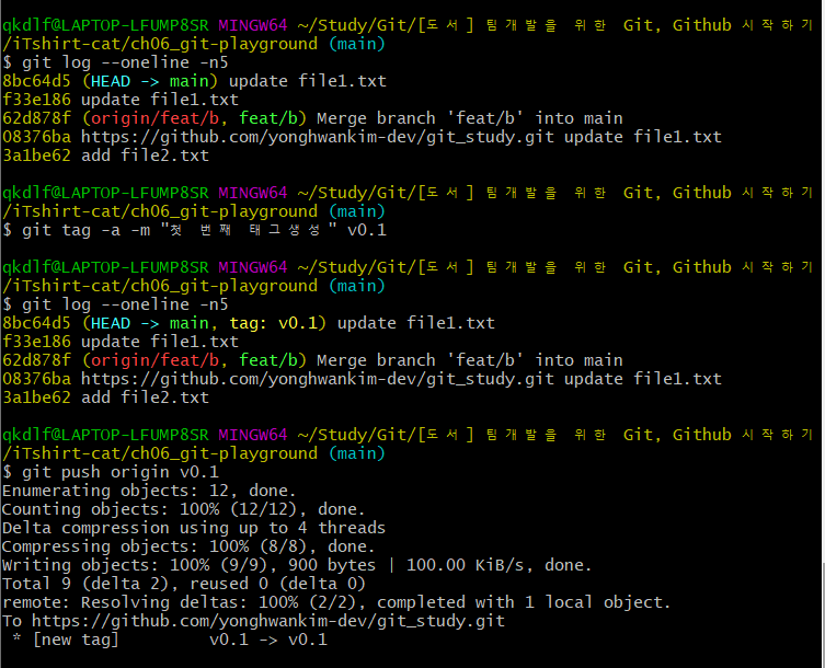 (main) $ git tag -a -m "첫 번째 태그 생성" v0.1 # 주석 있는 태그 작성