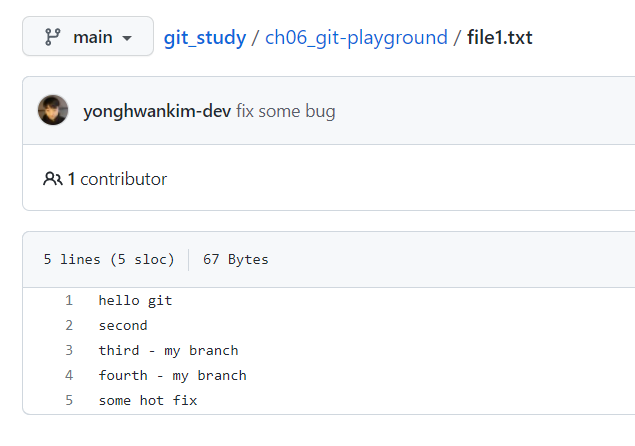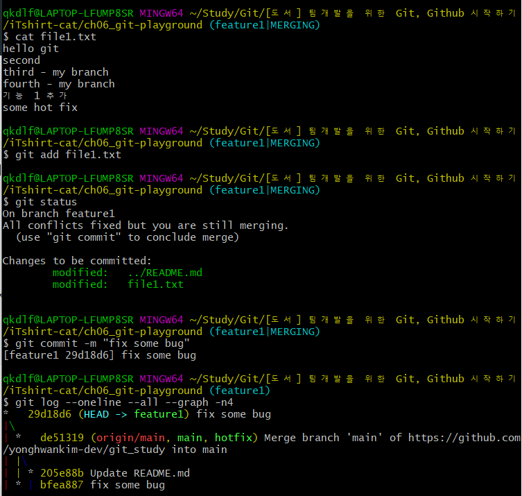 (feature1|MERGING) ch06_git-playground $ cat file1.txt # 최종 변경 내용 확인