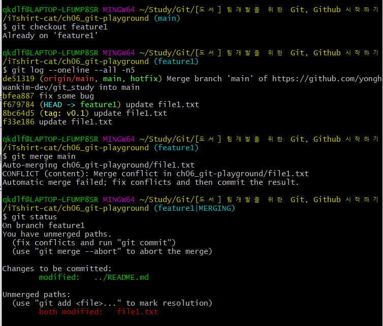(feature1|MERGING) ch06_git-playground $ git status # 실패 원인 파악하기