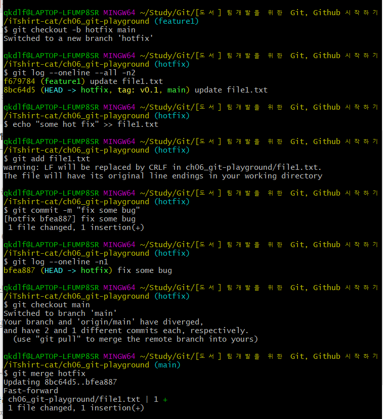 (hotfix) ch06_git-playground $ echo "some hot fix" >> file1.txt