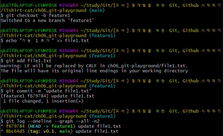 (feature1) ch06_git-playground $ git commit -m "update file1.txt" # 스테이징