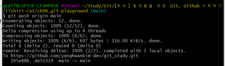 (main) ch06_git-playground $ git push origin main # 원격 저장소로 push