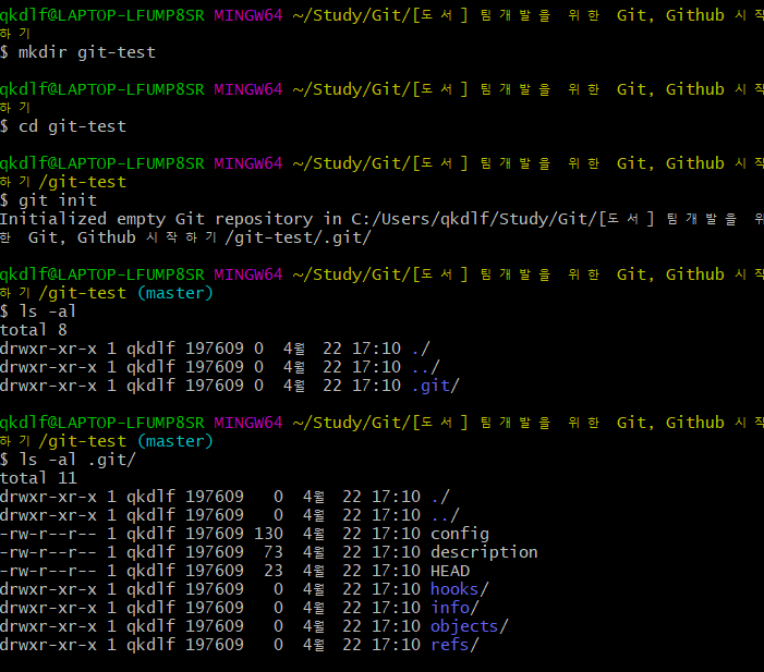 git-test $ ls -a .git # .git 폴더 확인, index가 생성되어 있음