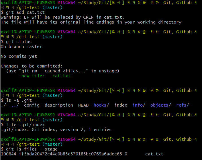 git-test $ git ls-files --stage # 스테이지 파일의 내용 확인