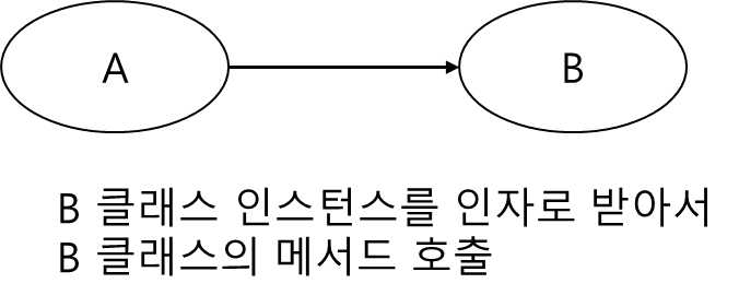 위와 같이 클래스 A는 클래스 B의 인스턴스를 인자로 받아서 메서드(methodB)를 호출합니다. 이 두 클래스는 서로 직접적인 관게에 있습니다. 이를 그림으로 표현하면 다음과 같습니다.