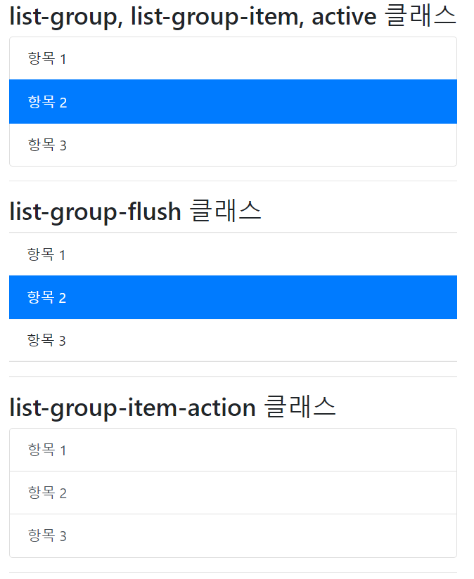 <h3>list-group, list-group-item, active 클래스</h3>