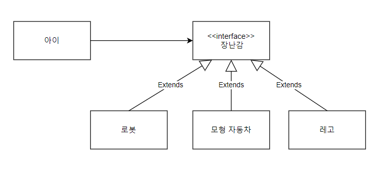 위와 같이 Toy라는 추상 클래스를 정의하고 자식 클래스로 Lego 클래스와 Robot 클래스(Lego 클래스와 구조 동일)를 정의한다. 따라서 Kid 클래스가 setToy 메소드를 통해서 Lego 인스턴스 또는 Robot 인스턴스를 인자로 받아도 의존성 주입을 통해서 toy 필드 멤버에 저장이 가능하고 play() 메서드를 통해서 출력문을 수행할 수 있다.