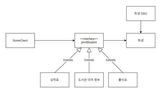 위의 그림과 같이 새로운 출력 매체를 표현하는 인터페이스(printSutdnet)를 추가하게 하고 변경이 있더라도 SomeClient 클래스가 개별적인 클래스(성적표, 도서관 대여 명부, 출석표)를 처리하도록 하지 않고 위의 그림처럼 인터페이스에서 구체적인 출력 매체를 캡슐화해 처리하도록 한다.