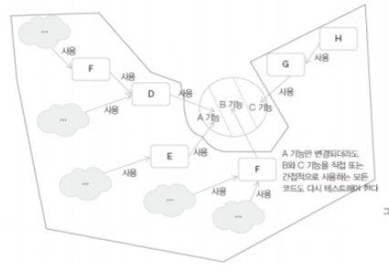 위와 같이 다른 클래스 때문에 Student 클래스에 변경사항이 생기면 Student 클래스를 사용하는 코드와 전혀 관계가 없더라도 직접 또는 간접적으로 사용하는 모든 코드를 다시 테스트 해야 한다. 위와 같은 상황으로 인해서 회귀 테스트가 발생한다.
