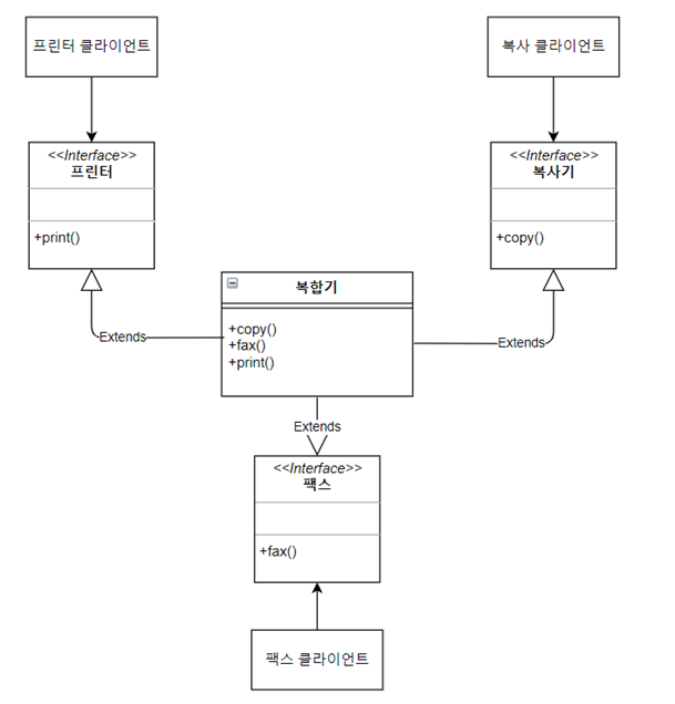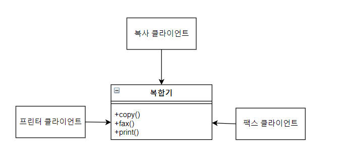 위의 그림과 같은 복합기 클래스는 매우 비대해질 가능성이 크다. 왜냐하면 복합기라는 클래스 하나에 수 많은 기능이 추가될 수 있기 때문이다. 하지만 복합기 클래스는 모든 기능을 클라이언트가 동시에 사용하는 경우는 거의 없다. 즉, 프린터 클라이언트는 팩스 클라이언트의 변경으로 인해 영향을 받지 않아야 한다.