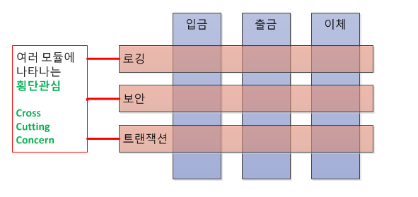 - 대표적인 예로 로깅, 보안, 트랜잭션과 같은 횡단 관심(Cross-Cutting Concern)이 존재한다.
