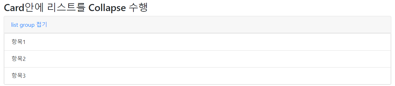 다음 예제는 이전 예제와는 다르게 card-body 영역 대신 list-group을 넣어 리스트 부분을 접었다 펼 수 있도록 하는 예제입니다.