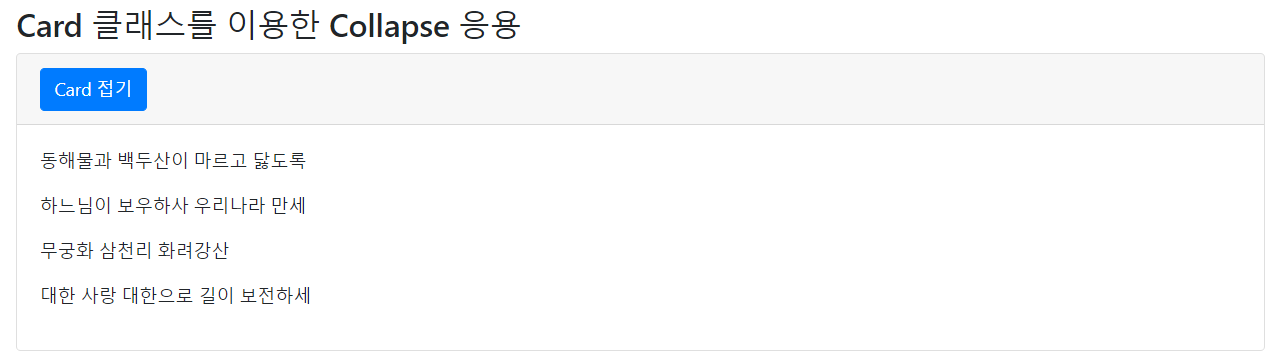다음 예제는 Card 안에 card-body 영역을 접었다 펼 수 있도록 collapse를 설정하는 예제입니다.