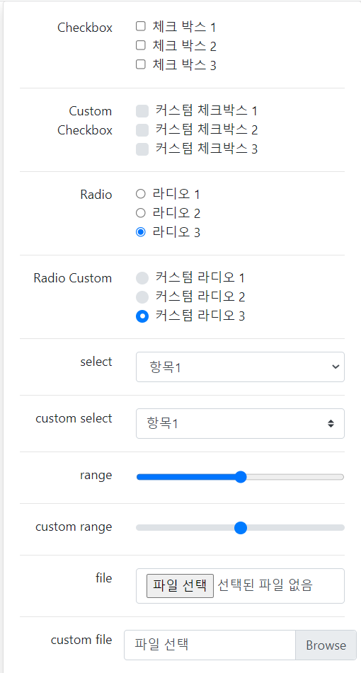 - 입력 : custom-control-input, custom-select, custom-range, custom-file-input