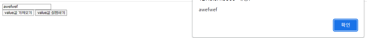 위 결과는 입력창에 문자열을 입력후 value값 가져오기 버튼을 클릭한 결과입니다.