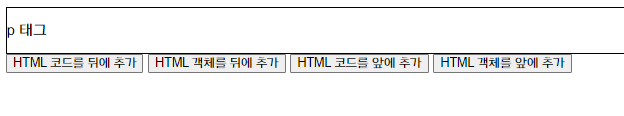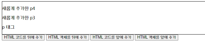 위 실행결과는 "html 코드를 앞에 추가" 버튼을 누르고 "html 객체를 앞에 추가" 버튼을 누른 결과입니다.