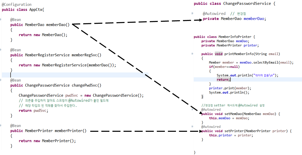 ChangePasswordService의 memberDao 필드의 타입은 MemberDao이므로 일치하는 타입을 가진 memberDao 빈이 주입된다. 유사하게 MemberInfoPrinter의 setMemberDao() 메서드의 memberDao 파라미터 타입이 MemberDao 클래스 타입이므로 setMemberDao() 메서드에 일치하는 타입을 가진 memberDao 빈이 주입된다.