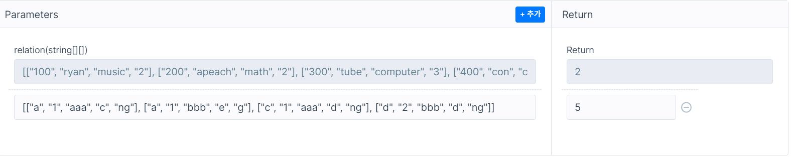 - 유일키를 만족하는 조건은 해당 컬럼들의 문자열을 생성하였을 경우 중복되지 않아서 relation 2차원 배열의 행수와 동일해야 합니다.