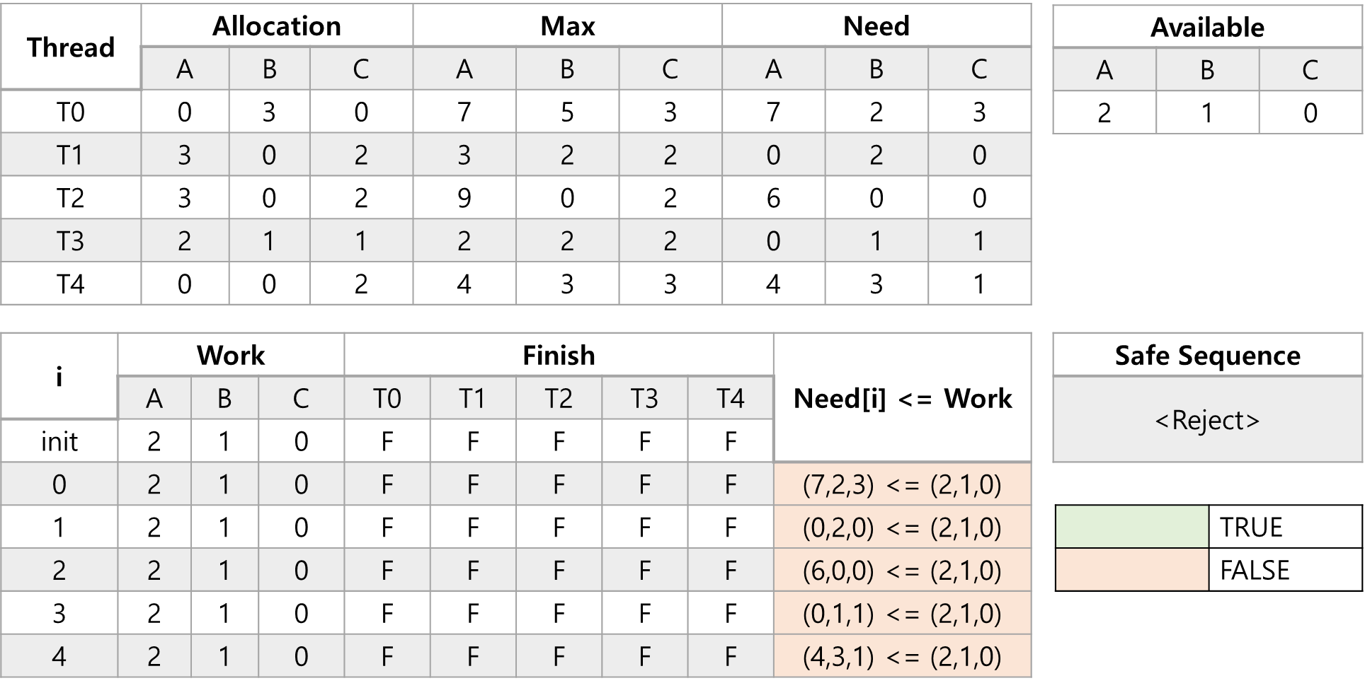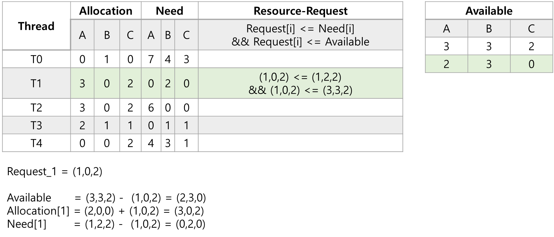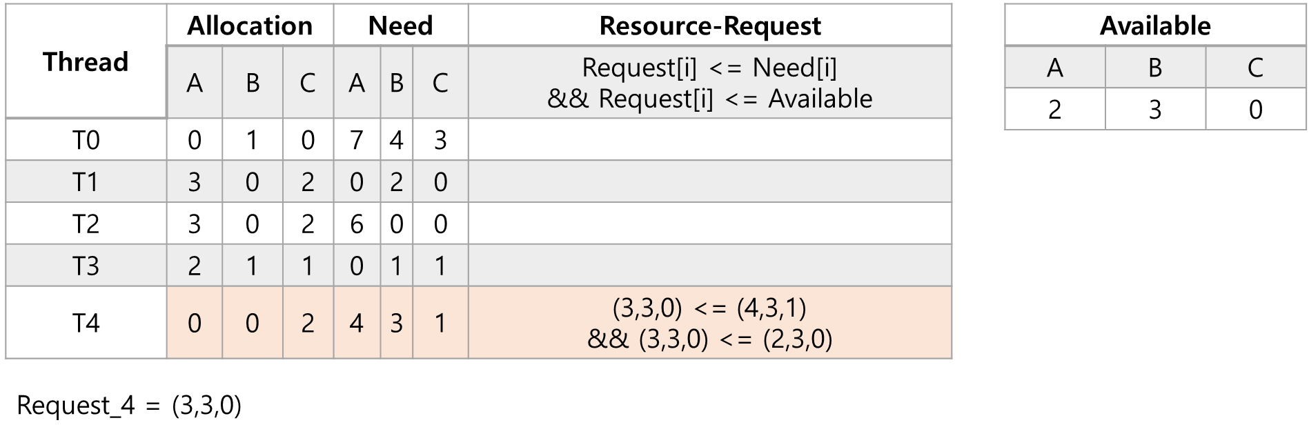 - 쓰레드 T4가 자원요청을 (3,3,0)으로 요청하였다고 가정할때 Resource-Request 조건을 만족하는지 확인합니다.