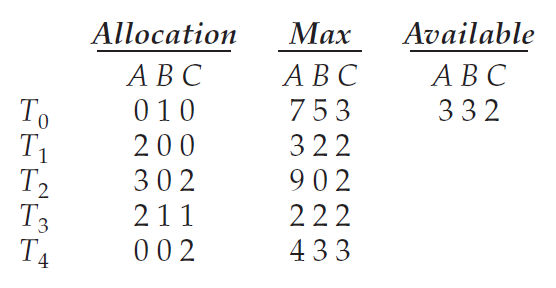 - 예를 들어 쓰레드 T0은 A자원의 인스턴스를 최대 7개, B 자원의 인스턴스를 최대 5개, C 자원의 인스턴스를 최대 3개까지 요청할 수 있습니다.