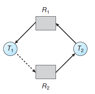 - 시스템은 추후-요청 간선(T1->R2)을 자원-할당 그래프에 넣어 교착상태가 발생하는지 계산합니다.