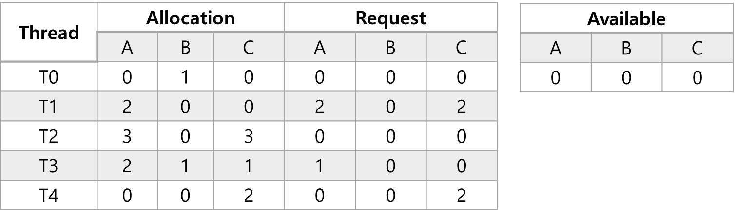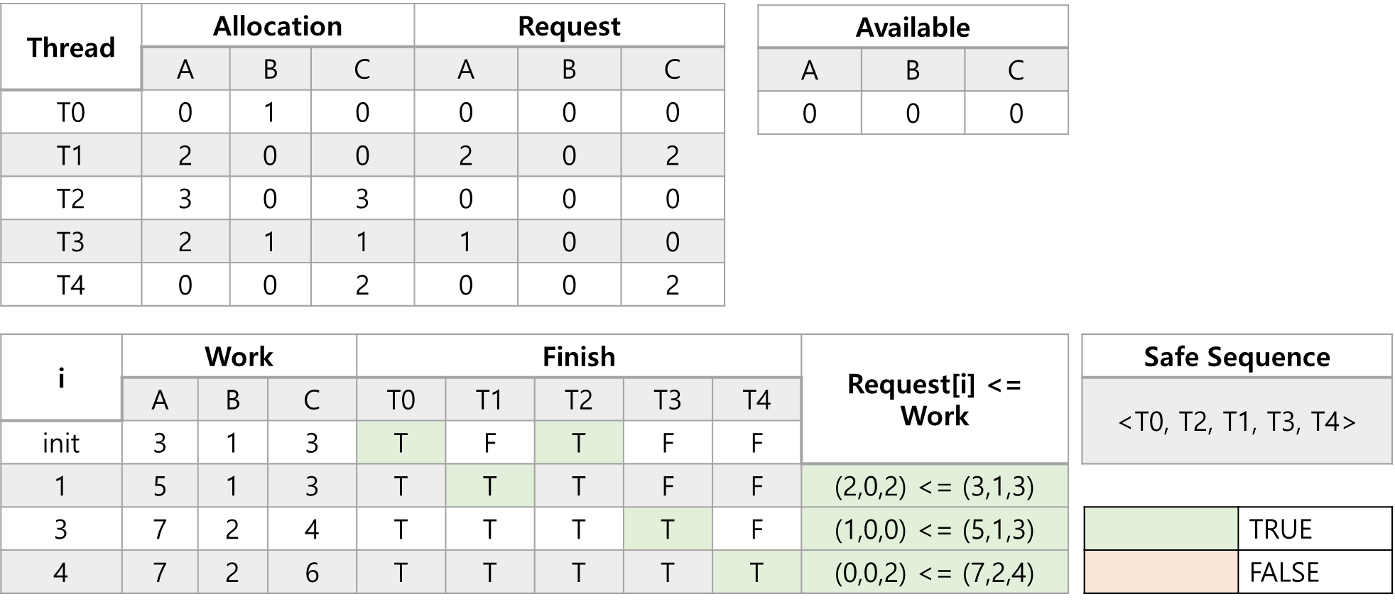 - 만약 Allocation[i] != 0라면 Finish[i] = false, Allocation[i] == 0이라면 Finish[i] = true