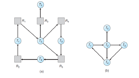 다음은 같은 자원 요청 상황을 자원-할당 그래프와 대기 그래프로 표현한 그림입니다.