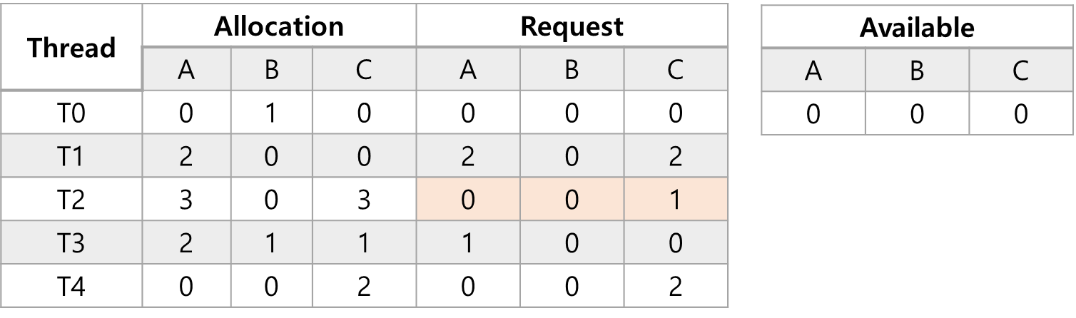 쓰레드 T2가 자원 요청 = (0,0,1)을 하는 경우