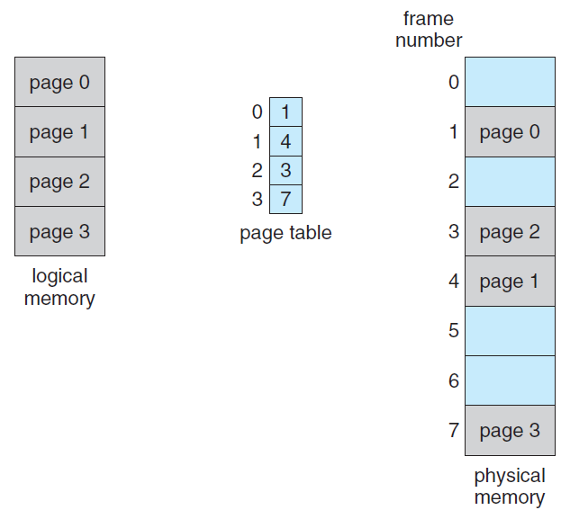 - 논리적인 주소의 페이지 번호는 물리적인 주소의 프레임 번호로 매핑됩니다.