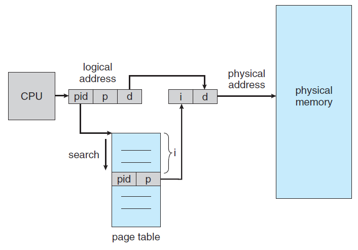 - 페이지를 가지고 있는 대신에, 프로세스에 대한 정보를 포함된 가상 주소로 구성된 각각의 실제 페이지에 대해 반전된 페이지 테이플을 사용합니다.