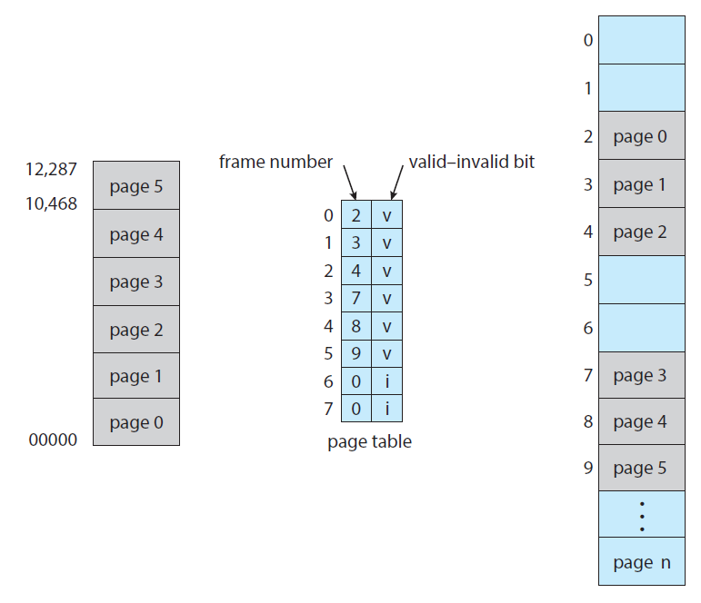 - valid-invalid bit : 하나의 추가적인 비트입니다. 일반적으로 페이지 테이블에서 각각의 엔트리에 첨부됩니다.