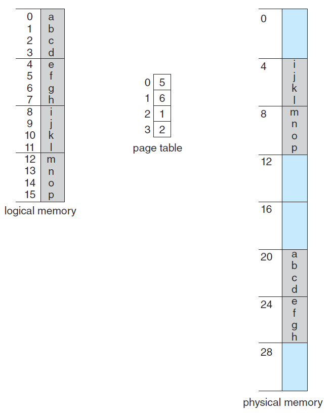 다음 그림은 4byte 크기의 페이지를 가진 16byte 크기를 가진 논리적인 주소를 이용하여 페이지 테이블에 매핑하여 물리적인 주소 공간에 올리는 그림입니다. n = 2^2 = 4, m = 2^4 = 16이 됩니다.