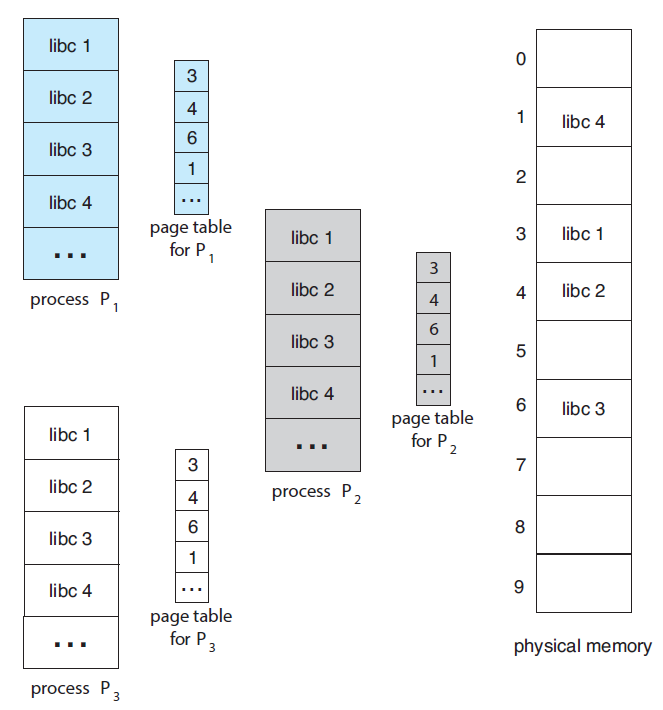 - 표준 C 라이브러리 libc를 모든 프로세스가 각자의 libc 복사본을 프로세스 주소 공간에 가지고 있다고 가정합니다. 이는 매우 비효율적입니다. 그래서 만약 libc 라이브러리 같은 코드처럼 Reentrant Code라면 공유할 수 있습니다.