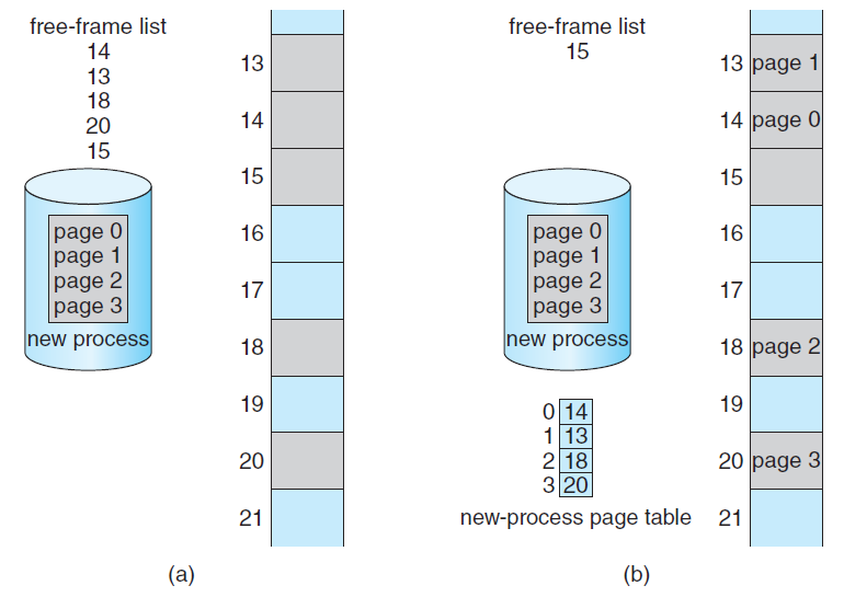 실행할 시스템에 프로세스가 도착한 경우에 메모리 할당을 위해 페이지로 표현된 크기가 검사됩니다. 페이지들을 비어있는 프레임 리스트에 매핑시켜 메모리에 할당합니다. 그 결과 비어있는 프레임은 15번밖에 안남았습니다.