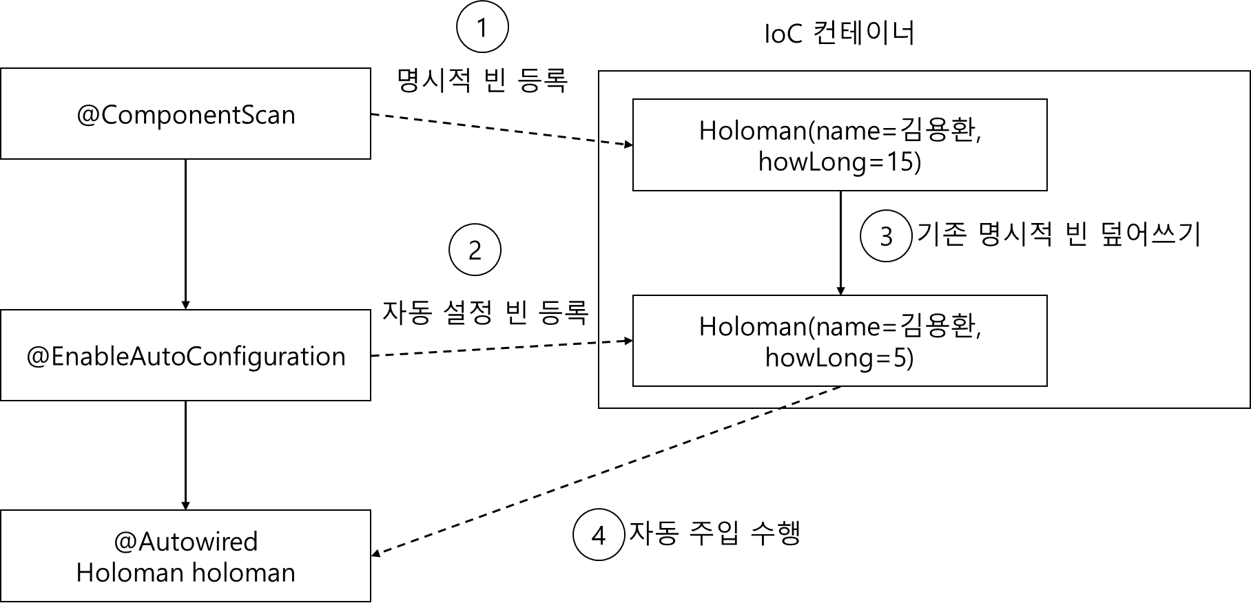 - 명시적 빈을 사용할때 무시되는 이유는 @EnableAutoConfiguration 수행시 기존 빈을 덮어씌우기 때문이다.