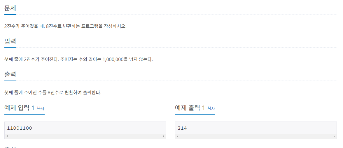입력받은 2진수 문자열에서 뒤쪽부터 3개씩 잘라서 그에 맞는 8진수로 변경하여 따로 누적시킨다. 그리고 최종적으로 누적한 문자열 변수를 거꾸로 변경하면 최종 8진수가 될 것이다. 주의할 점은 3개씩 잘라서 변환시키다가 숫자가 1개(1) 또는 2개(11) 남을 수 있다. 이 경우 앞자리에 0을 채워준다.