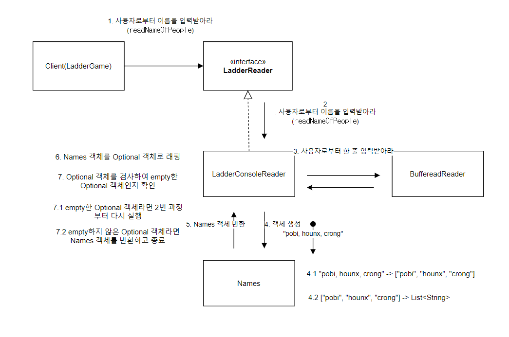 - 위 그림에서 3번 과정인 사용자로부터 한 줄을 입력받는 것이 온전한 LadderConsoleReader 객체가 수행하는 역할이라고 생각하였습니다.