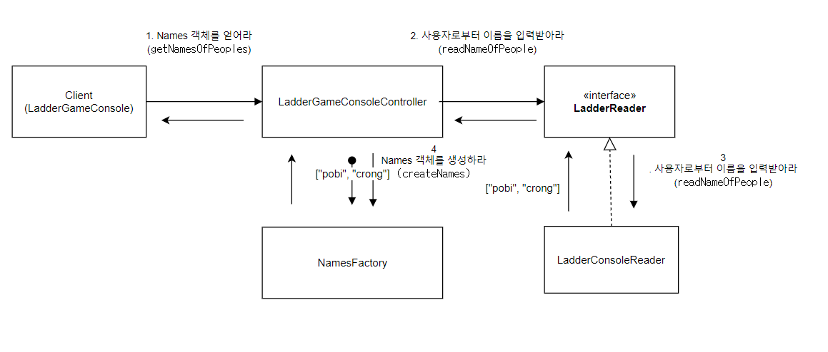 위와 같이 LadderGameConsoleController 객체의 getNamesOfPeople 메소드의 흐름을 그림으로 표현하면 다음과 같습니다.