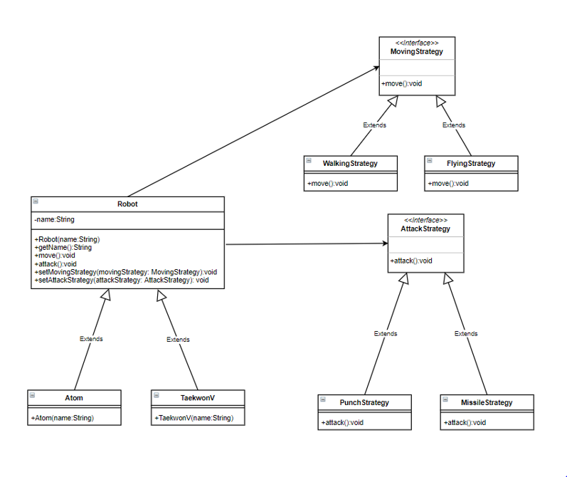- AttackStrategy, MovingStrategy : 각각의 로봇이 취할수 있는 공격방식과 이동방식에 대한 인터페이스
