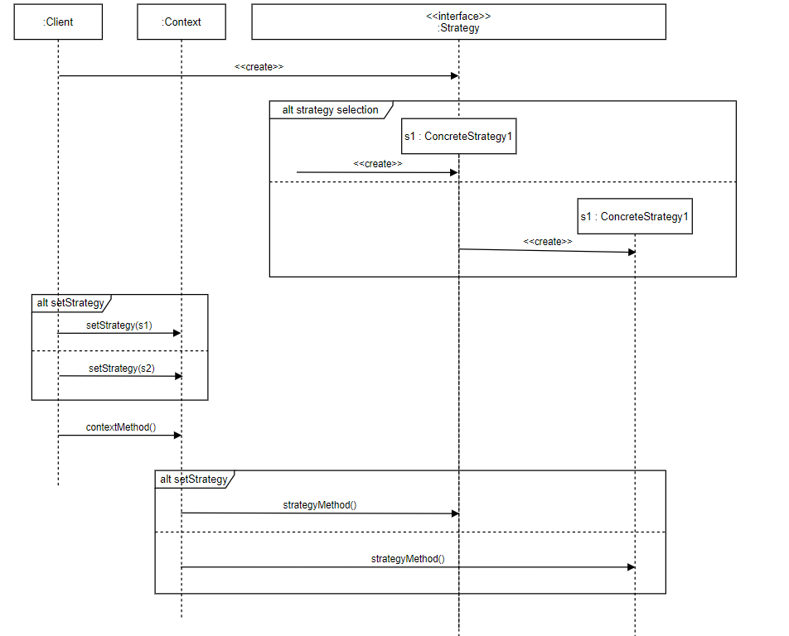 클라이언트가 원하는 스트래티지 객체를 생성하고 이를 Context 객체에 바인딩하면 Context 객체는 바인딩된 스트래티지 객체의 타입에 따라 적절한 행위를 실행한다.
