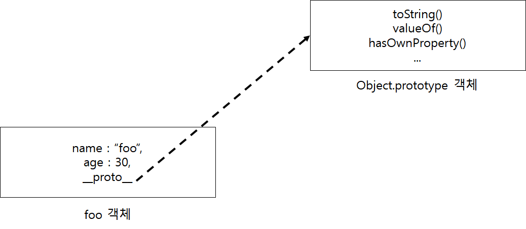 ECMAScript 명세서에는 자바스크립트의 모든 객체는 자신의 프로토타입을 가리키는 [[Prototype]]라는 숨겨진 프로퍼티를 가진다고 설명하고 있다. 크롬 브라우저에서는 __proto__가 바로 이 숨겨진 [[Prototype]] 프로퍼티를 의미한다. 즉, foo 객체는 자신의 부모 객체를 __proto__라는 내부 프로퍼티로 연결하고 있는 것이다.