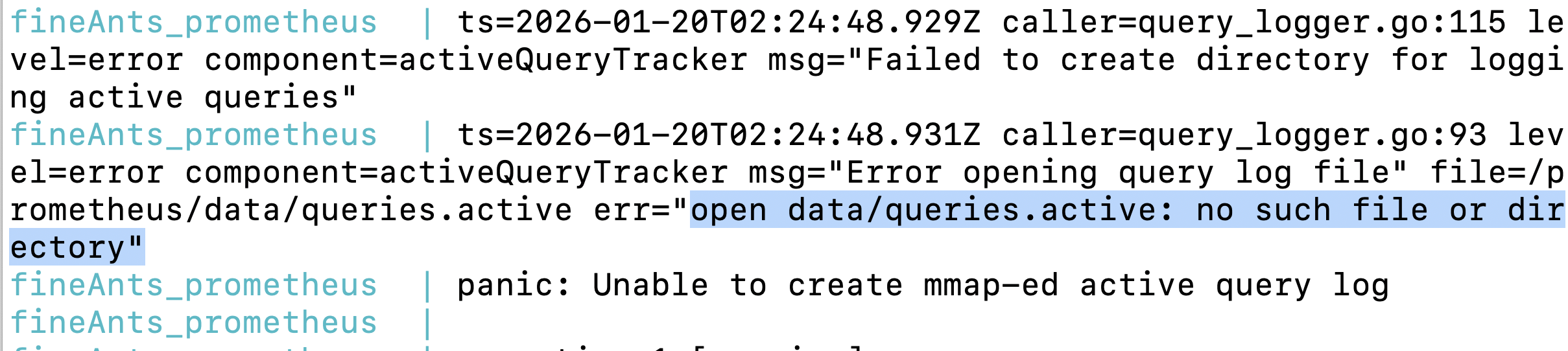 위 에러 결과를 보면 컨테이너의 `/prometheus/data/queries.active` 파일을 `./data` 디렉토리 아래에 작성하려고 했으나 `./data` 디렉토리가 존재하지 않아서 에러가 발생했다는 결과입니다.