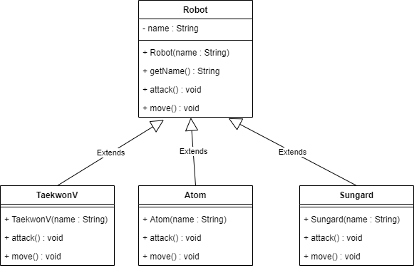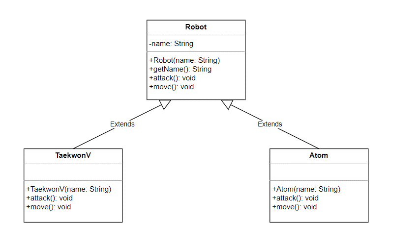 클래스 다이어그램에서 Atom 클래스(아톰)와 TaekwonV 클래스(태권V)는 Robot이라는 추상 클래스의 자식 클래스로 설정하였다.