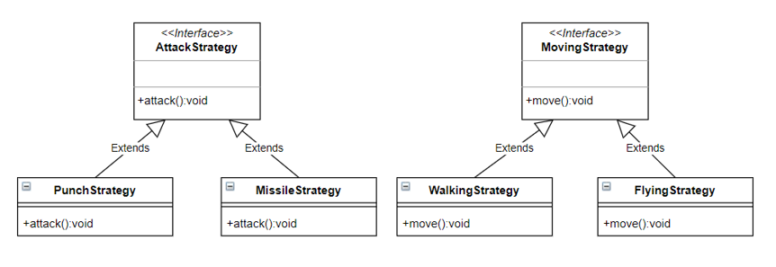- WalkingStrategy, FlyingStrategy : 이동방식 인터페이스에 대한 구체적인 클래스
