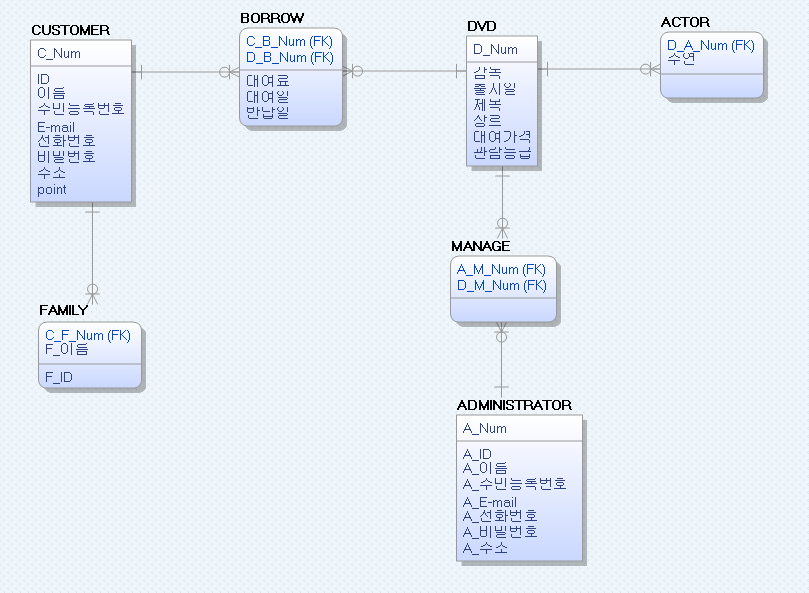 - ADMINISTRATOR : 고유한 관리자 번호(A_Num)와 ID, 이름, 비밀번호, 주민등록번호, 전화번호, 주소 등에 대한 정보를 가진다. 관리자는 새로 DVD가 출시되면 등록하고, 목록을 관리하는 등 DVD에 관한 모든 업무를 관리한다.