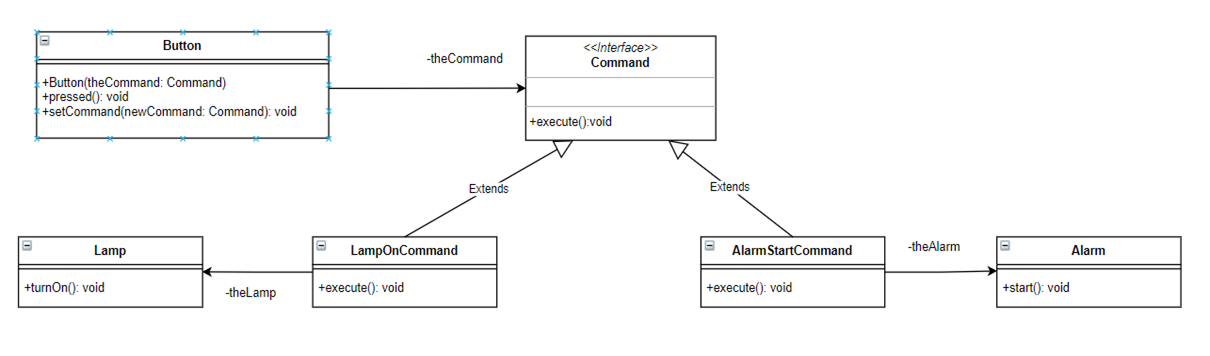 Button 클래스의 pressed 메서드에서 Command 인터페이스의 execute 메서드를 호출할 수 있게 함으로써 LampOnCommand와 AlarmCommand 클래스의 execute 메서드를 실행할 수가 있다.
