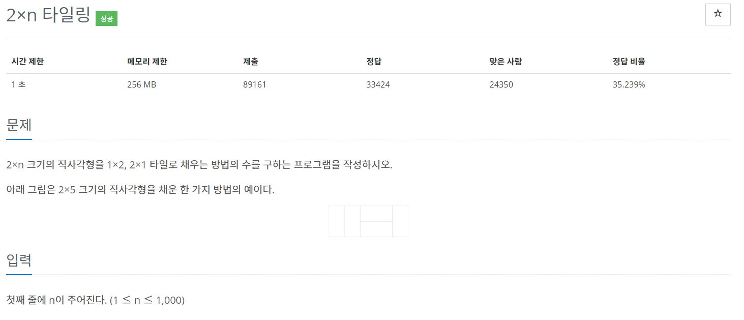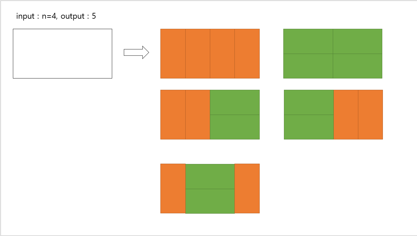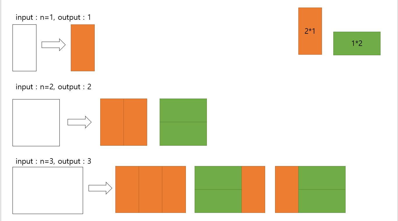 - 2*n 크기의 직사각형이 존재할때 1*2 타일과 2*1 타일로 채우는 경우의 수를 구합니다.