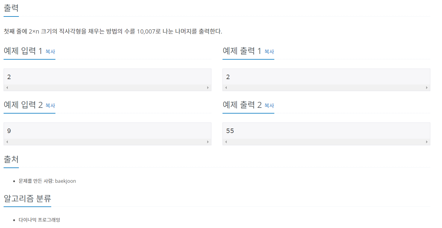 - 출력시 채우는 경우의 수를 10007로 나눈 나머지를 출력합니다.