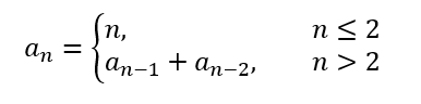 n=1~4의 패턴으로 봤을때 2*n 타일링의 경우의 수는 피보나치 수열을 따르고 있습니다. 따라서 점화식을 구성하면 다음과 같습니다.